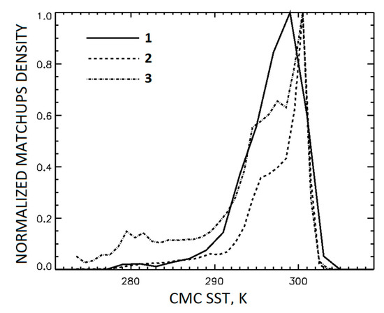 Normalized histograms of matchups within (1) training data set of matchups of satellite observations with in situ SST (TMDS-IS) (N = 795,877) (2) TMDS-L4 (N = 1.19 × 109), (3) same as (2) but taking into account weights of the pixels within the MDS-L4 (as explained in Section 3). All histograms are shown as functions of Canadian Meteorological Center (CMC) SST.