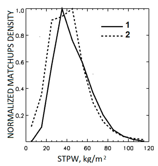 Normalized histograms in terms of total precipitable water vapor content along slant line of sight (STPW) of (1) matchups with in situ SSTs within TMDS-IS and (2) weighted matchups of nighttime ABI pixels with CMC L4 SSTs within the MDS-L4.