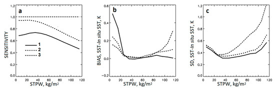 (a) Sensitivity, (b) bias and (c) standard deviation with respect to in situ SST of the (1) GR-IS SST, (2) GR-L4 SST, and (3) PWR-L4 SST. All shown as functions of slant-path total precipitable water vapor content, STPW.