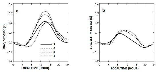 The ABI/AHI offers five infrared atmospheric transparency window bands (centered at 3.9, 8.4, 10.3, 11.2, and 12.3 µm) suitable for SST, with high spatial resolution (2 km at nadir, which degrades to ~12 km at satellite view zenith angles, VZA~67°), frequent scans (every 15/10 minutes for ABI/AHI; note that NOAA also considers “Mode 6” for ABI, with a 10 minute refresh rate), and superior radiometric performance [3,4,5]. The NOAA Advanced Clear-Sky Processor for Oceans (ACSPO) system, initially developed to retrieve SST from polar-orbiting sensors, such as NOAA and MetOp AVHRRs; S-NPP and NOAA-20 VIIRS; and Terra and Aqua MODIS [6], was modified with the launch of Himawari-8 to process data of new generation geostationary sensors [7,8,9]. SSTs retrieved from GOES-16 ABI and Himawari-8 AHI reveal a clear and smooth diurnal cycle. However, accurate quantification of the diurnal cycle in SST requires modifications to the retrieval algorithms currently employed with polar-orbiting sensors.