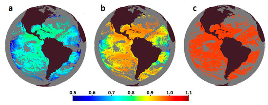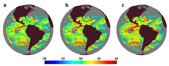 The three algorithms have been implemented within the experimental version of ACSPO and tested on GOES-16 ABI data from 1 March–31 March 2018. Since the operational ACSPO Clear-Sky mask [39] uses retrieved SST as one of the clear-sky predictors, the clear-sky SST domains may be somewhat different for different retrieval algorithms. To ensure the comparison of the algorithms on the same domain, a single clear-sky mask, generated with the GR-L4 SST, was consistently employed with all three algorithms. Figure 6 shows geographical distributions of sensitivities for three SSTs retrieved from the ABI data on 1 March 2018 at 20:00 UTC (close to the maximum of the diurnal warming signal within the GOES-16 ABI domain). Figure 7 shows deviations of the retrieved SSTs from CMC SST for the same ABI data. The statistics of sensitivities for the images in Figure 6 and of TS − TS0 for the images in Figure 7 are given in Table 3. In Figure 6, the GR-IS SST has the lowest and variable sensitivity. The GR-L4 SST sensitivity is higher than for the GR-IS SST and is also variable. For both the GR-IS SST and the GR-L4 SST, the sensitivities are especially low in the low latitudes at large VZAs, due to large atmospheric absorption along the line of sight, consistent with the behavior of sensitivities at large STPWs in Figure 4a. The GR-IS sensitivity is also reduced in the near-polar zones, which are poorly represented within TMDS-IS. The PWR-L4 SST, by design, provides optimal and uniform sensitivity, µ ≡ 1, over the full SST domain.