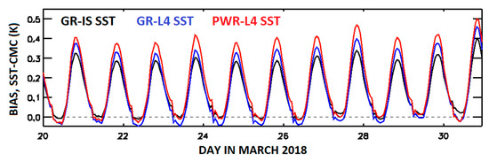 Figure 8 shows the time series of biases in retrieved SST–CMC SST for 20–30 March 2018. The DCMs increase from GR-IS to GR-L4 and to PWR-L4 SST. Table 4 shows the mean sensitivities and DCMs for three algorithms averaged over the month from 1–31 March 2018. The DCMs in Table 4 are roughly proportional to mean sensitivities.