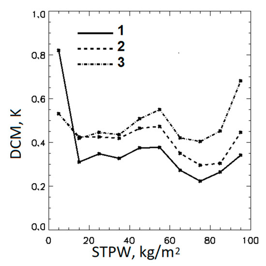 Figure 9 shows the mean values of DCMs, averaged from 1–31 March 2018, as functions of STPW. The corresponding dependencies for sensitivities are similar to those produced from matchups and shown in Figure 4a. The unrealistically large DCM in the GR-IS SST at STPW < 10 kg/m2 confirms that this algorithm is inefficient at small STPWs. Other than that, the changes in DCM between the algorithms are consistent with the differences in the sensitivities. The difference between the DCMs estimated from the GR-IS SST and the GR-L4 SST is the largest at STPW < 60 kg/m2. In contrast, the difference between the DCMs for GR-L4 SST and PWR-L4 SST is small at 10 < STPW < 40 kg/m2 and increases with STPW growing over 40 kg/m2 due to increased difference in sensitivities. Assuming that that the maximum of the clear-sky pixels distribution takes place at 30 < STPW < 50 kg/m2, consistent with the maximum of the distribution of matchups in Figure 3, the adjustment of the DCM estimates in the PWR-L4 SST at larger STPWs may essentially exceed the mean difference between the average DCM values for GR-L4 and PWR-L4 SSTs shown in Table 4.