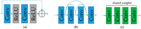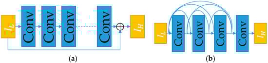 Recently, many methods (e.g., VDSR [16], EDSR [17], WDSR [18]) based on very deep neural networks outperformed the relatively shallow CNN model [15,19,20]. It can be observed that among these methods, there are two main strategies for the design of the SR model as shown in Figure 1.