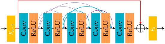 (3) Feature fusion layer: Since the output of the - fold RIB will be the input of the (n + 1)-th fold RIB, it is essential to introduce a convolutional layer to keep the same feature channel number and fuse the local feature maps. We assumed that these are D densely-connected layers, each consisting of G feature maps, and the channel number of the feature expanding layer is E. Hence, the concatenation of all preceding outputs will have D × G + E features. To further enhance the capacity of the RIB and improve the flow of information, we introduced a local residual path between the input and output of the RIB, hence the final output of the n-th fold RIB can be obtained by: