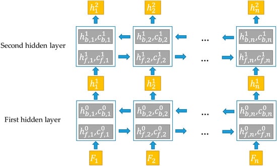 The structure of our BiConvLSTM layers. We concatenated all previous recursions [] in the order of the sequence as a temporal sequence. and denote the middle stage of the first hidden layer and the second layer, respectively, extracted from the forward and the backward ConvLSTM layer hidden states and .
