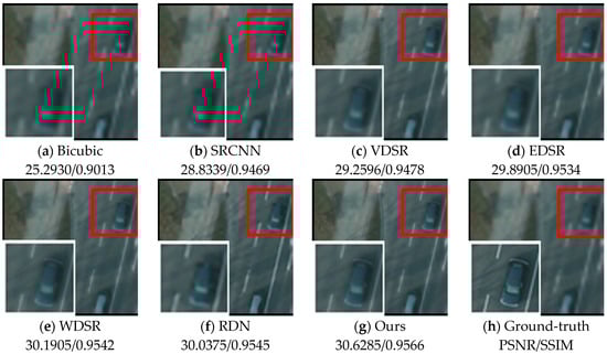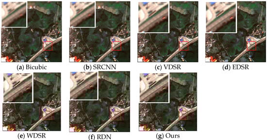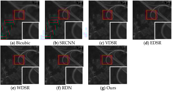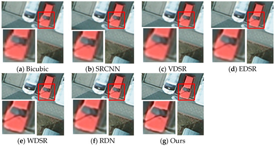 Figure 7 shows the comparisons of the SR results of these methods on the COWC test set, where our method could well reconstruct the contours of cars. Figure 8 shows the multispectral satellite images with blue, green, and red channels, and Figure 9 shows the panchromatic channel images. Our methods reconstructed a sharper and clear roof with fewer artifacts, and models like RDN [29], which have too many parameters, were more likely to over-fit, so their performance could be degraded with over-training.
