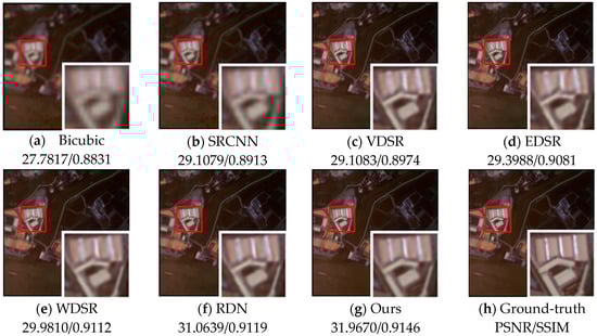 (5) Failed cases: As the spatial resolution of GF-2 images are only 4 m and 1 m, too much high-frequency information is lost especially in the area full of buildings. As shown in Figure 15, the reconstruction of the white road is much better than the dense buildings at a scale of ×4. It is quite a common phenomenon for large scale reconstruction that too much loss of information usually makes SR methods fail to recover the fine details and the reconstruction result over-smooth.