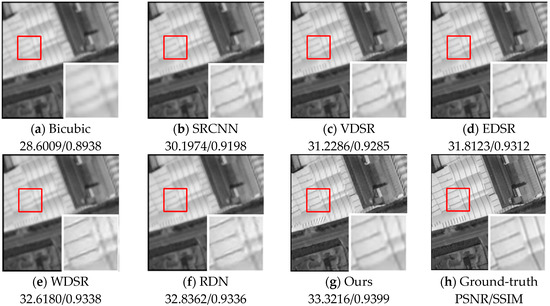 We also tested these models with original images to generate SR results. There are many non-reference quality metrics [53,54,55] to quantify these real-data results. Our experimental datasets contain natural images, multispectral images, and panchromatic images, hence we employed BRISQUE [55] metric to quantify the qualities of different types of reconstruction images without references. We used these models trained under our experimental dataset at a scale factor ×3 and took the original spatial resolution images as inputs to yield SR results. Table 4 presents the ultimate mean BRISQUE over the test images of these methods for ×2, ×3, and ×4 upsampling factors.
