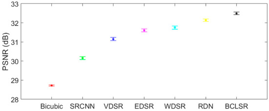 Figure 13 shows the mean and standard deviation of PSNR on COWC datasets. Our method outperformed the RDN [29] by about 0.3 dB, and the standard deviation is ±0.0674 dB, which demonstrate the effectiveness of our method. Furthermore, compared with methods based on deep learning, the standard deviation of bicubic interpolation method 0.023 dB is smaller than other data-driven methods. Nonetheless, the standard deviations of other methods are all below 0.08 dB and the accuracies are much higher than the interpolation method.