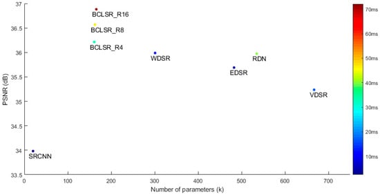 Comparison of the PSNR and the model size of SR methods on the COWC datasets for the scale factor ×2. The color of the point that corresponds to the bar on the right indicates the processing times with a 256 × 256 output image size on GPUs.