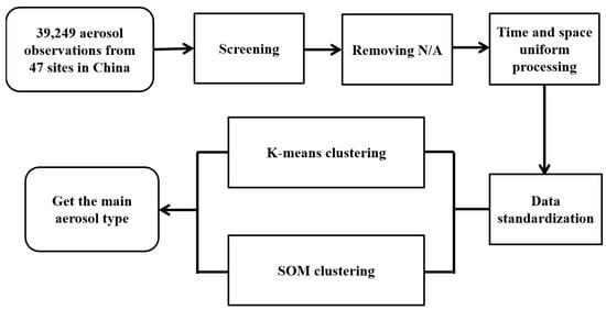 In total, the 47 sites selected in this paper have 39,249 aerosol observations (Level 2.0 AERONET data) from April 1998 to January 2017. Optical depths and alpha are retrieved by direct sun observation with higher accuracy. Therefore, these two parameters are first used as the basis of screening. For this study, the range of acceptable optical depths is to , and the acceptable alpha (Angstrom Exponent) is greater than ( refers to one standard deviation) []. Data beyond these thresholds are considered abnormal and are removed. This brings the sample size down to 36,477. Data with missing values cannot participate in clustering, so we remove it and 18,191 observations remain. There are four sites with less data removed in this process. To reduce spatial bias of the data, two sites in North China (Xianghe and Beijing_CMA) where site density is high were eliminated because they are too close to the Beijing site while the data quality is not as high. The remaining observations of spring, summer, autumn and winter are 4432, 1387, 3207 and 4244, respectively. The summer data volume is much smaller due to increased cloudy and rainy conditions. We therefore further reduce the temporal bias by evenly reducing the spring and winter data by 2/3 (reduce 2 out of every 3), and the autumn data by 1/2 (reduce 1 out of 2). This results in the number of observations in four seasons being 1478, 1387, 1603 and 1414, respectively, so that the data entering in the clustering algorithm are evenly distributed in time and space. After quality control and pre-processing, 5882 observations from 41 sites remain for further analysis. Figure 2 shows the data processing, and Table 2 indicates the number of stations and observations after each processing step over the four regions shown in Figure 1. All parameters are further standardized by their standard deviation before entering the clustering algorithm.