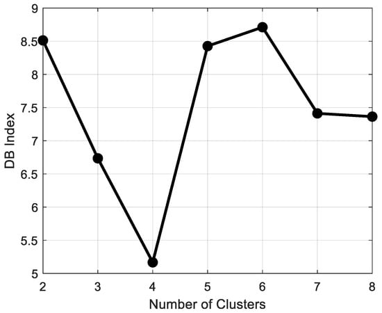 We further use the Davies–Bouldin index [] to define the “best” number of clusters. The DB index is defined as the ratio of within-cluster scatter () to between-cluster separation (). The specific definitions are as follows: