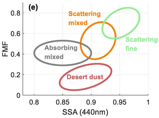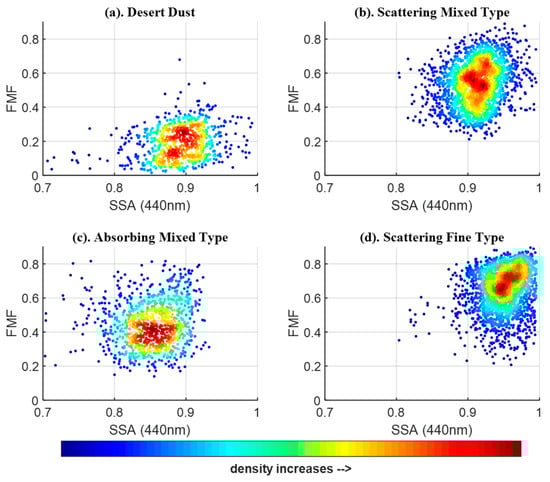 (a)–(d) is the density graph of SSA and FMF. Red indicates high density value, and blue indicates small density value. (e) gives a range for different aerosol types.