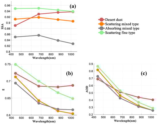 Optical parameters of the aerosol types: (a) single scattering albedo, (b) asymmetry parameter, (c) aerosol optical depth.