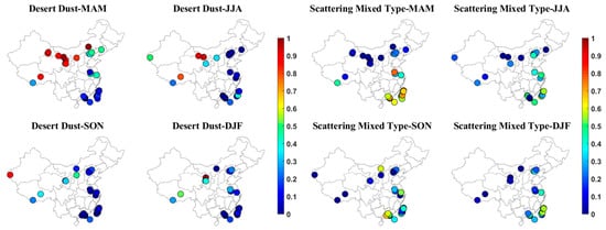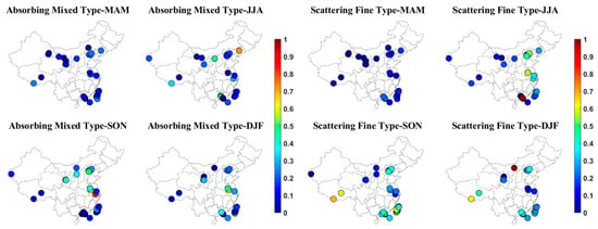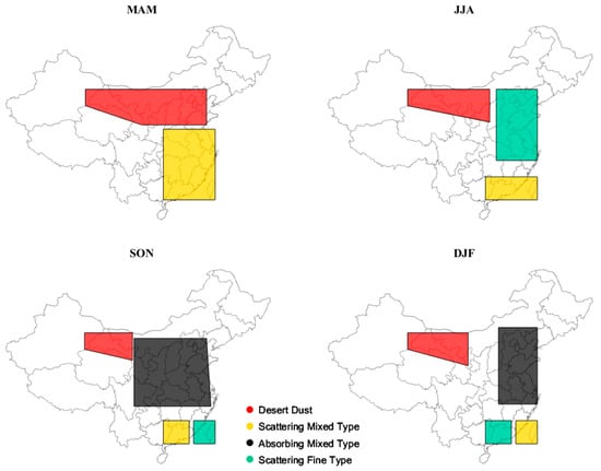 Briefly, dust aerosols are mainly found over Northwest China and the North China Plain in the spring, scattering mixed aerosols over Southeast China in the spring and summer, absorbing mixed type over East China in the fall and winter, and scattering fine type over East China in the summer and fall.