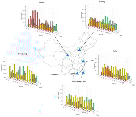 Muti-year mean monthly frequency of aerosols in five sites. Type 1 is dust desert. Type 2 is scattering mixed type. Type 3 is absorbing mixed type. Type 4 is scattering fine type.