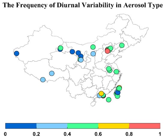 An advantage of sun photometers is their continuous measurements during the daytime, allowing the examination of diurnal variability of aerosol type. We conduct a statistical analysis on the diurnal variation of aerosol types by calculating the averaged frequency of diurnal aerosol type change. Specifically, for each station, the number of days with at least four daily observations is counted, and then the number of days on which more than one type is found is calculated; the ratio between the latter and the former thus represents the frequency of diurnal change of aerosol type. The results are shown in Figure 9. We can see that except for Northwest China, diurnal type change is frequently observed (frequency > 0.5) for most East and South China sites. This is reasonable as in the Northwest aerosol composition is relatively simple (mainly dust as discussed in the previous section), whereas in East and South China, complicated mixtures are often found due to both local emission and remote transport. We also analyzed the frequency of occurrence of the four aerosol types in the morning and afternoon but did not find outstanding patterns. Therefore, diurnal variability of aerosol types is a common phenomenon and cannot be ignored. This has important implications for both climate modeling and satellite remote sensing. Current climate models generally use averaged optical parameters while different aerosol type will result in different radiative forcing. In addition, aerosol retrieval from geostationary platforms has become increasingly popular. Such practice also needs to assume the aerosol model and without accounting for the diurnal variability of aerosol type will inevitably introduce uncertainties in the results. We will present detailed analysis of the effect of aerosol diurnal change on radiative forcing and aerosol retrieval in a following study.