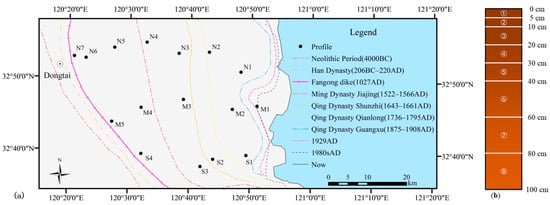 Locations of soil profiles and sampling depth in a profile: (a) sixteen sampling sites, which, generally, ran perpendicular to the coastlines; The soil ages were estimated based on the historical coastlines []; (b) eight samples were collected from every profiles according to the following intervals: 0–5, 5–10, 10–20, 20–30, 30–40, 40–60, 60–80 and 80–100 cm.