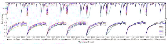 A continuum removal (CR) technique can be used to isolate particular absorption features for spectrum analysis and to define the band depth [,]. In this work, spectral curves were smoothed following Savitzky and Golay [], with a second-order polynomial across 21 smoothing points using Unscrambler X v. 10.0 (CAMO Software AS, Oslo, Norway). These curves were then transformed via continuum removal in ENVI 4.7 (ITT Visual Information Solutions Inc., Broomfield, United States). For each soil profile, the smoothed and continuum-removed spectra from the eight depth intervals were joined in sequence to create a pseudo multi-depth soil spectral curve (Figure 4) according to Vasques et al. [].
