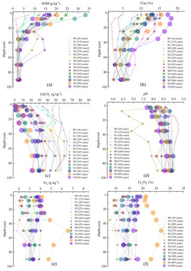 Depth distribution of soil properties depending on the age of soil profiles: (a) soil organic matter (SOM); (b) clay; (c) CaCO3; (d) pH; (e) Fed; (f) Fed/Fet.