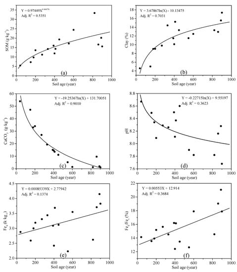 Generally, the soil pH value decreased with soil age, following changes in the CaCO3 content (Figure 5d and Figure 6d). After about 1000 years of development, the soil pH decreased from >8.5 to nearly 7.5. The relationship between pH and CaCO3 is significant and positive (Table 2). Therefore, the best-fit curve of pH scatter was logarithmic, the same as that of CaCO3 (Figure 6d). There were significant negative relationships between pH and SOM and Clay (Table 2). Vidic and Lobnlk [] demonstrated that carbonate leaching and the corresponding decrease in pH created favorable conditions for clay translocation.