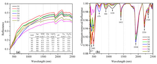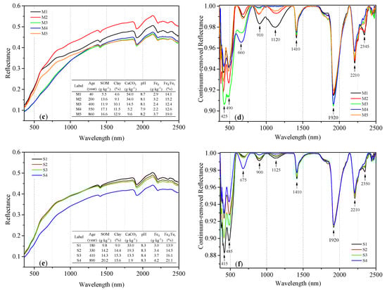 SOM, an important soil component, has a significant effect on soil reflectance. Generally, reflectance intensity decreases due to strong absorption of SOM and increases considerably following SOM removal []. In this study, the original reflectance intensity in the whole wavelength decreased with soil age (Figure 7a,c,e). This difference in intensity was mainly attributable to SOM changes, i.e., overall changes in reflectance intensity demonstrated the process of SOM accumulation with age. The reflectance intensities of N6, M4 and S4 were lowest in every group because their contents of SOM are highest in their respective group. Some exceptions existed in every group because the reflectance intensity was affected by other properties such as clay minerals, iron oxide and carbonate. This is also the reason that some spectral curves were similar, although SOM content is different (for example, S1 and S2, M3 and M4).