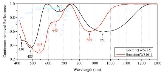 Continuum-removed spectra of hematite and goethite (the United States Geological Survey (USGS) mineral spectral library). Absorption features around 430, 485, 675, and 950 nm by Goethite and Absorption features around 545, 645, and 865 nm by Hematite.