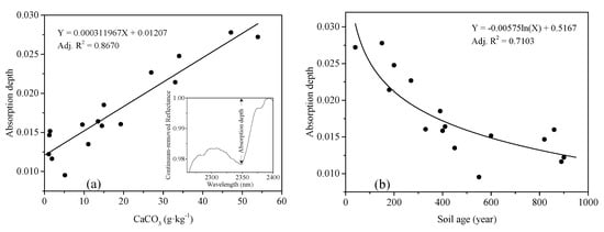 Hunt and Salisbury [] concluded that five characteristic bands appear near 1900, 2000, 2160, 2350 and 2550 nm for carbonates in the NIR range. The absorption feature of CaCO3 near 2341 nm can be used to estimate carbonate content via continuum-removed reflectance spectroscopy [,,]. In this study, the absorption depth at 2345 nm decreased from younger soil to older soil with a decrease in CaCO3 in every group (Figure 7b,d,f). This absorption depth at 2345 nm was positively correlated with CaCO3, i.e., the absorption depth increased linearly with increasing CaCO3 content (Figure 9a). In addition, the change in the absorption depth at 2345 nm with soil age is distinct and a logarithm function fitted the relationship between the absorption depth and soil age (Adj. R2 = 0.7103) (Figure 9b). Therefore, we can conclude that the spectral feature near 2345 nm can be used to estimate the CaCO3 content and to reveal the soil CaCO3 leaching process in this area.