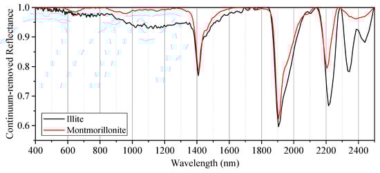 The obvious absorption features near 1412, 1918, 2210, 2345 and 2445 nm and the two shoulders near 1465 and 2095 nm in these CR curves (Figure 7b,d,f) suggested that the clay mineral in these soil samples is mainly illite. Montmorillonite has absorptions near 1412, 1918, 2210 and the two shoulders, but the absorption depth at 2210 nm is near half of that at 1918 nm (Figure 10). Therefore, montmorillonite is also present in these samples.
