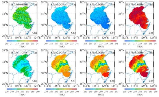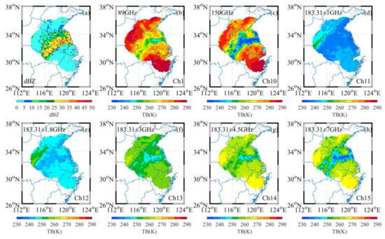 Figure 2 and Figure 3 show the spatial distribution of ground-based radar reflectivity and satellite-observed brightness temperature for 15 channels of MWHS-2 for the case on 4 July 2016. It can be seen that the spatial distribution of radar measurements and brightness temperature of MWHS-2 were consistently correlated with respect to water vapor channels, window channels, and low-level temperature-sounding channels (channels 7–9). The averaged brightness temperature at window channels 1 and 10 was much higher than that of water vapor channels, due to the intense surface emissions in summer.