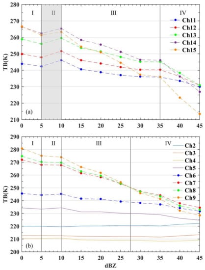 As indicated in shaded region II in Figure 4a, brightness temperatures of channels 11–15 increase within 5–10 dBZ, illustrating that cloud emission dominates when rain rate is low and raindrop size is small. Then, brightness temperatures decrease with radar reflectivity as a result of the scattering effect by precipitation-sized hydrometeors as shown in region III and, more sharply, in region IV, due to the existence of larger hydrometeors.