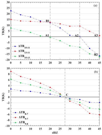 From Figure 4, it can be seen that not only brightness temperatures (TB) but also the differences between these channels (∆TB) exhibited a good estimation of precipitation. Figure 5a,b shows the brightness temperature differences (∆TB) versus radar reflectivity for three humidity channels and temperature-sounding channels, respectively. It shows that the differences among brightness temperatures decreased with radar reflectivity in general. Regarding the humidity-sounding channels, brightness temperature differences between channels 15 and 13 (∆TB15-13), channels 15 and 11 (∆TB15-11), and channels 13 and 11 (∆TB13-11) shifted from a positive to a negative value at points A1, A2, and A3, respectively (Figure 5a). It is also noticeable that the order of the ∆TB15-13, ∆TB15-11, and ∆TB13-11 reversed at points B1 and B2. In terms of the temperature-sounding channels (Figure 5b), brightness temperature differences between channels 9 and 7 (∆TB9-7), channels 9 and 8 (∆TB9-8), as well as channels 8 and 7 (∆TB8-7) declined linearly below 40 dBZ and approached 0 K at point C. When radar reflectivity was below ~27 dBZ, it was found that ∆TB9-7 > ∆TB9-8 > ∆TB8-7 > 0 K existed because channels were further away from the center at 118.75 GHz and could see deeper into the troposphere where they detect higher temperatures in clear-sky and light precipitation. It is worth noting that the low-level sounding channels were subjected to greater scattering from cloud and precipitation and significant brightness temperature depression under moderate and intense precipitation conditions. Therefore, the relationship was reversed, ∆TB9-7 < ∆TB9-8 < ∆TB8-7 < 0 K, where the radar reflectivity was above ~27 dBZ. This feature makes it evident that the order relation of the differences between brightness temperatures can provide a useful insight into precipitation intensity.
