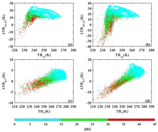 Figure 6 shows the scatter plots of ∆TB as a function of TB for channel 11 and channel 7, and the color of plots represents ground-based radar reflectivity. When radar reflectivity was above 15 dBZ, there was a tail of cases with decreasing TB and ∆TB. This is because brightness temperatures of low-level channels displayed a stronger depression in the presence of larger hydrometeors.