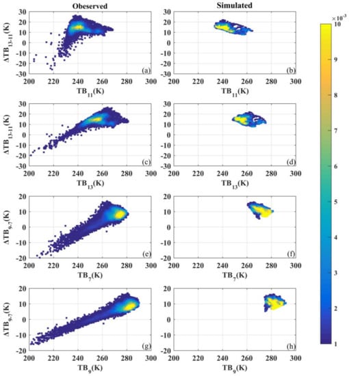 Figure 7 shows the joint probability density function (PDF) for TB and ∆TB, with the left column for observed values and the right column for simulated values. From Figure 7a,b, it can be seen that the maximum PDF is near the brightness temperature from channel 11 (TB11) at ~240 K and ∆TB13-11 at ~15 K. Figure 7c,d shows that the maximum of the PDF is near brightness temperature from channel 13 (TB13) at ~255 K and ∆TB13-11 at ~15 K. TB11 at its maximum PDF is colder than TB13, resulting from the fact that temperature decreased with height in the troposphere, and channel 11 was sensitive to a higher region than channel 13.