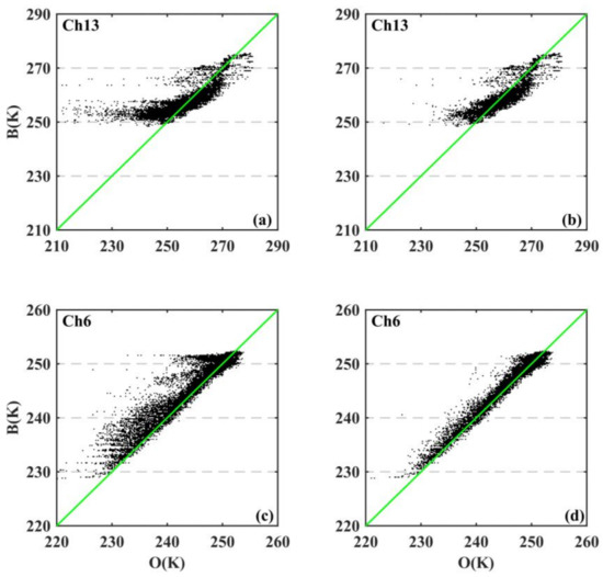 A cloud detection method that co-locates measurements from the advanced microwave sounding unit-A (AMSU-A) and ATMS with high spatial resolution cloud products from a moderate resolution imaging spectroradiometer (MODIS) and visible infrared imager radiometer suit (VIIRS) was presented by Han et al. [20]. This method improves the accuracy of tropical cyclone forecasts and radiance assimilation by better eliminating cloud-contaminated microwave sounder field-of-views. Chen et al. [21] used CloudSat data under non-precipitation cloudy conditions to validate the accuracy of the community radiative transfer model (CRTM), and they found that the O−B biases and standard deviation errors are low for advanced very high resolution radiometer (AVHRR) channels 4 and 5, but became lager under cirrus and mixed-phase cloudy conditions. On the other hand, the O−B biases for the microwave humidity sounder (MHS) on board National Oceanic and Atmospheric Administration -18 (NOAA-18) from 89 GHz to 190 GHz under cloudy conditions are only marginally different from those under clear skies [21], possibly due to the fact that microwave radiation can penetrate through clouds, other than thick clouds and precipitation [20,22,23,24]. It was implied that the large O−B biases should be attributed to precipitation rather than cloud.