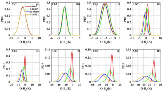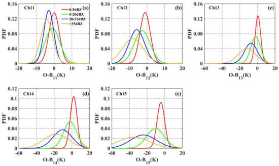 The PDF distribution of O−B under different intensities of precipitation is shown in Figure 11 and Figure 12 for channels 11–15 and channels 2–9, respectively. It shows that the mean values of O−B generally decreased within 0–5, 5–20, 20–35, and >35 dBZ in sequence for each channel. Channels 2–4 show slight dependence on radar reflectivity, as their weighting functions were mostly in the stratosphere and were almost unaffected by the cloud and precipitation in the troposphere. Whereas, for the other channels, the uncertainty (standard deviation) of O−B under different categories of radar reflectivity displayed considerable variability, owing to precipitation intensity and frequency.