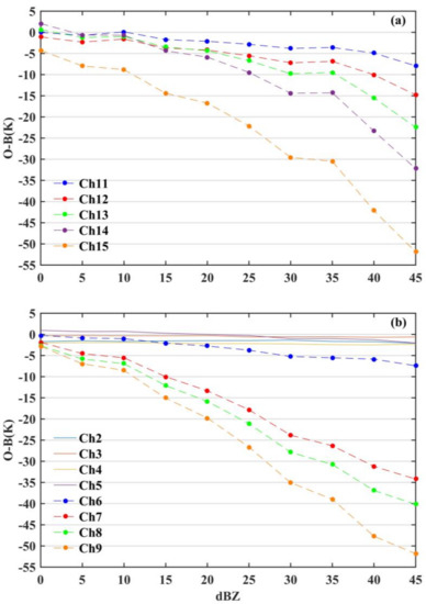O−B versus radar reflectivity for channels 11–15 (a), and channels 2–9 (b), with data sampled from July to September in 2016.