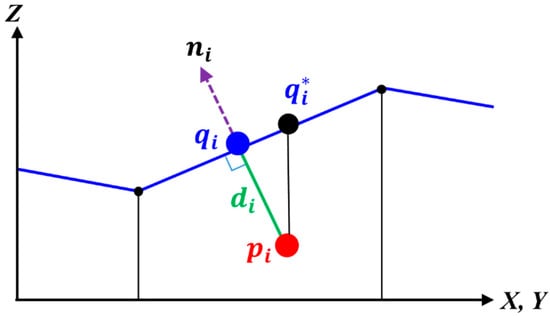 The objective of the matching approach is to find the transformation between the points and the surface, which consists of a 3D rotation and a 3D translation as well as a scale parameter, such that the sum of the squared distances between the points and surface is minimized. For the LHD algorithm, the height difference between a point and a point on the DEM is used as the measure of distance. Instead of the height difference, this study’s approach shall use the shortest distance from the point to the surface at point as shown in Figure 1.