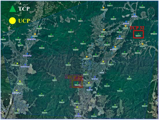 Distribution of unified control points (UCPs) (yellow dots) and triangulation control points (TCPs) (green triangles) in the Yangsan project region as shown on the NGII website. The two highlighted TCPs (#25 and #32) are discussed in more detail in the analysis of the results.