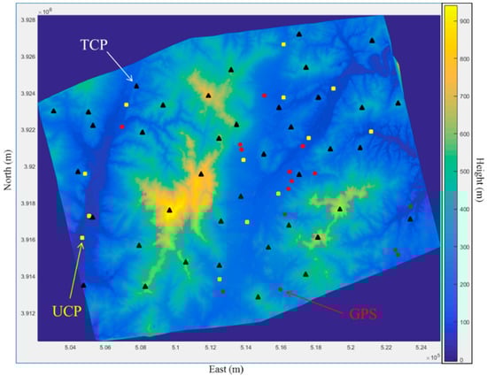 Generated DEM for the Yangsan region. UCPs, TCPs and GPS check points are overlaid.