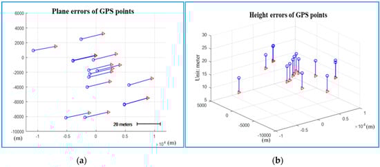 Deviations in GPS checkpoints. Displayed are (a) the horizontal and (b) the vertical differences between measured GPS coordinates and coordinates reconstructed from the KOMPSAT image pair (circles: reconstructed positions; triangles: GPS positions).