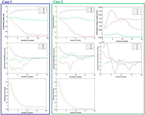 Convergence behaviour of the matching algorithm. The left and right columns illustrate the estimation process in case 1 (three translation parameters) and case 2 (three rotation angles and three translation parameters), respectively.
