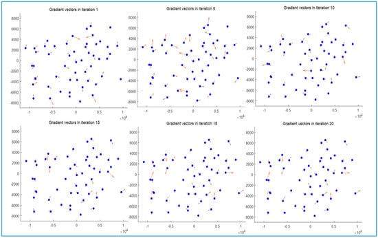 In order to observe the changes of the normal vectors in the course of the iterations, the components at the surface points are visualised for some iteration steps . are gradient vectors in and taken from the unit normal vectors. Figure 9 shows these gradient vectors for six selected iteration steps. Case 2 is used as an example. During the first 15 iterations, changes in the direction and slope (indicated by the length of the vectors) can be observed at many surface points. After that, only small changes are visible at a few points and from iteration 18, no change of the gradient vectors is visible anymore.