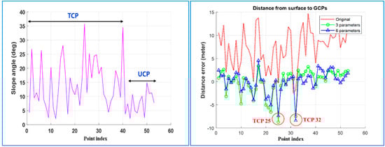 This signed distances are plotted in Figure 10 for all 40 TCPs and 13 UCPs. The distances across all points do not differ significantly between the results obtained with three (case 1) and with six parameters (case 2). The larger deviations can be observed for the TCPs. The left graph in Figure 10 shows the slope angles at the surface points that correspond to the TCPs and the UCPs.