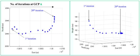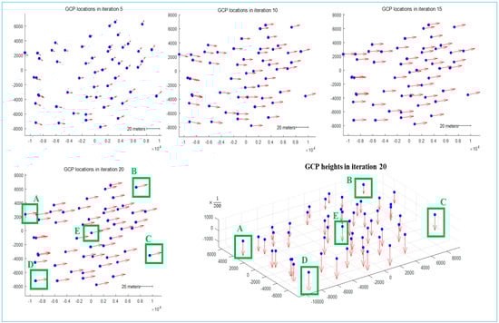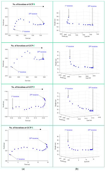 The transformation sequence over 20 iterations is illustrated in Figure 12 exemplarily for five GCPs marked by the green border in Figure 11. Four GCPs were selected which are close to the respective corners of the project area as well as one GCP which is located in the middle. The left column in Figure 12 shows the horizontal movement of the points over all iteration steps. In the right column, the vertical movement is visualized in a 3D view. The movement of GCPs B and E over all iteration steps appear remarkably smooth, which is particularly visible in the 2D plot (left column of Figure 12). Essentially, a smooth movement pattern can also be observed with the other three GCPs, although the 2D track appears more curved. With all GCPs, large movements of the points occur, more or less, during the first 15 iteration steps. The incremental displacements then become smaller and smaller until they are virtually zero after 18 iterations. As expected, the movement of the GCP correlates with the convergence behaviour of the estimated parameters (cf. Figure 8).
