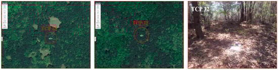 The location of the points in the KOMPSAT-3 image pair were inspected, which attracted attention in Figure 10 by particularly large distances. These are mainly points located at higher altitudes in the forested area. Particularly striking are the two GCPs with the numbers 25 and 32. Figure 5 shows their location within the entire project area. The two sections of aerial photos displayed in Figure 13 suggest a rich vegetation around these two GCPs. The on-site image capture of TCP #32 (Figure 13), which is available in the NGII database, confirms this assumption. It makes it clear that bushes and trees of probably 10 m height or more surround this TCP.
