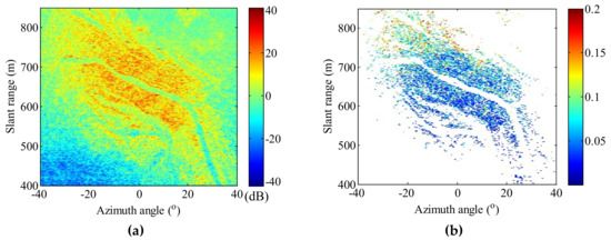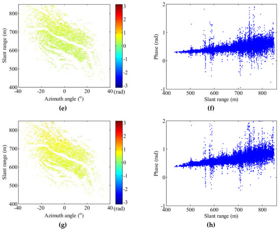 By building the AP components as a linear phase ramp over the range axis and estimating the AP parameters based on Equations (3)−(7), two interferograms IM A 30 and IM B 30 were compensated for with the conventional method. Figure 7a shows the compensated map CIM A 30 of IM A 30 , and Figure 7b shows its scatter diagram CSD A 30 . It can be noted that the linear phase over the range axis was well compensated for.
