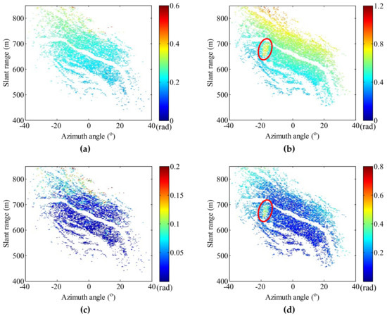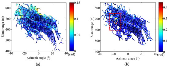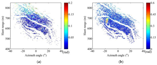 Figure 20a,b, respectively, show the deviation maps calculated with every PS’s phase sequence of Group A and Group B after the APC with the improved method. Figure 11c,d, respectively, show the deviation maps of Group A and Group B with the conventional method. As for Group A, the deviation maps with both methods were almost the same, and only a small number of PSs located at the far range had deviations larger than 0.1 rad. As for Group B with the conventional method, the PSs with deviations smaller than 0.1 rad made up just about 7.61%, and those with deviations smaller than 0.2 rad made up about 70.41%. With the improved method, the PSs with deviations smaller than 0.1 rad made up about 59.98%, and those with deviations smaller than 0.2 rad made up about 92.88%. The PS deviations were significantly reduced with the improved method.