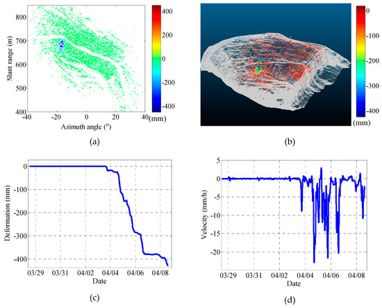 Figure 22a shows the cumulative deformation map of the monitoring scene with the proposed method. The maximum deformation for the elliptical area mentioned above could reach about −430 mm, where the minus sign represented the direction approaching the radar. Then, the deformation map was back projected onto a 3D terrain cloud that was acquired with a laser scanner to better locate the motional area, as shown in Figure 22b. The mine workers started to excavate the pit bottom after 4 April 2018. Then, a continuous sliding was caused along the pit slope and formed an elliptical motion area. Figure 22c,d show the deformation and velocity measurement curves of the motion center. The maximum velocity reached about −22.5 mm hour−1.